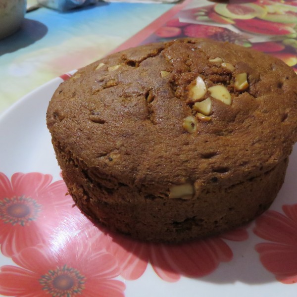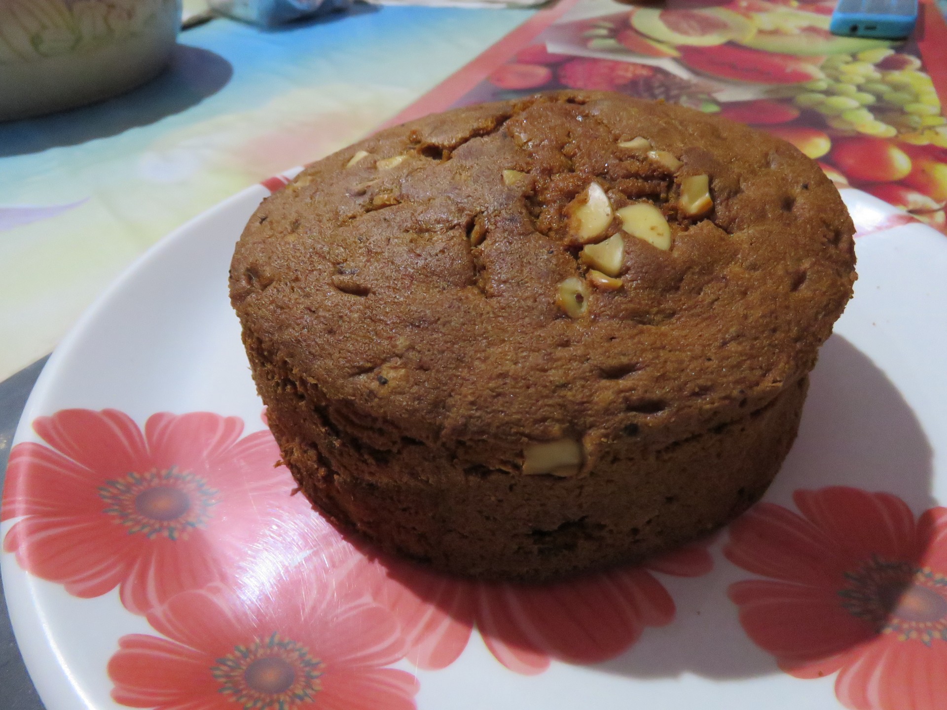 Homemade chocolate cake on the plate. Cake, cashew, raisin.