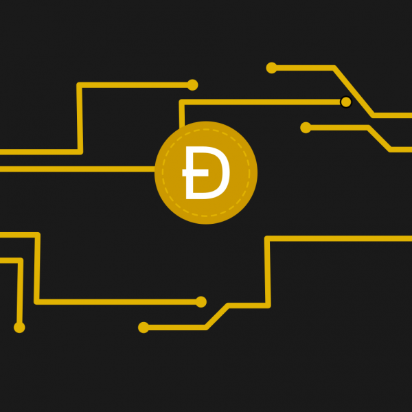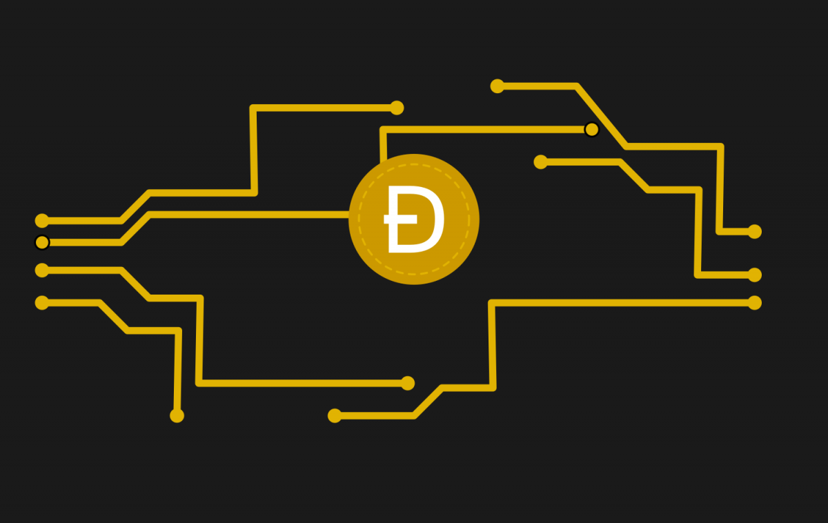 Digital currency dogecoin circuit image with a dark background.