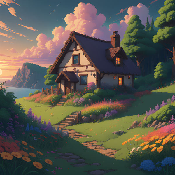 Pixel art of cottage in meadow forest.