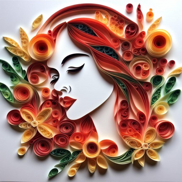 Paper quilling art of a female face surrounded by flowers and leaves.