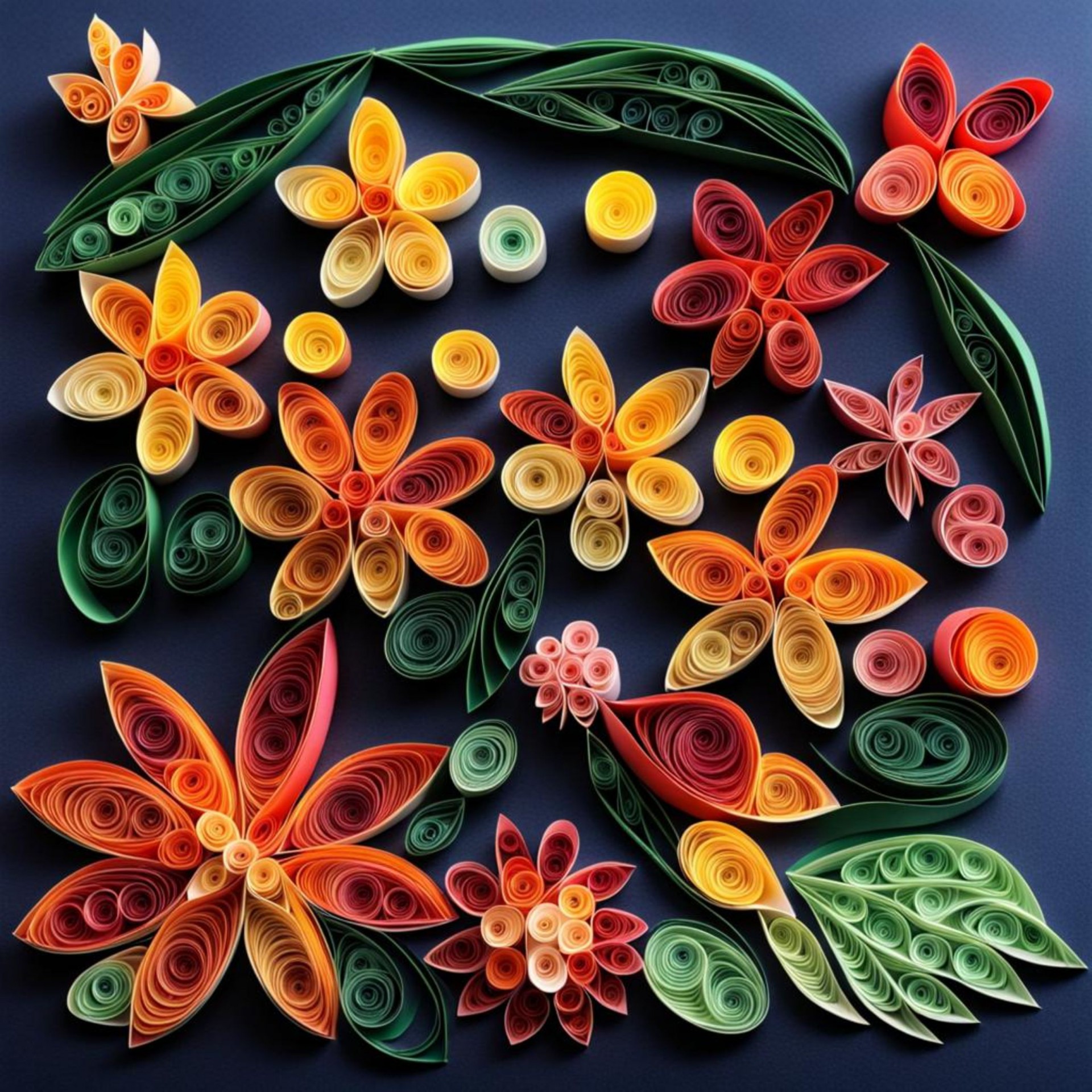 Paper quilling art of flowers and leaves.