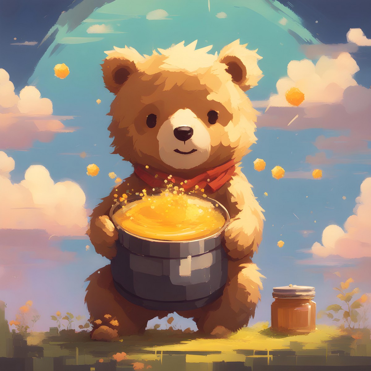 Acrylic pallet knife art of a little cute bear holding a honey pot.