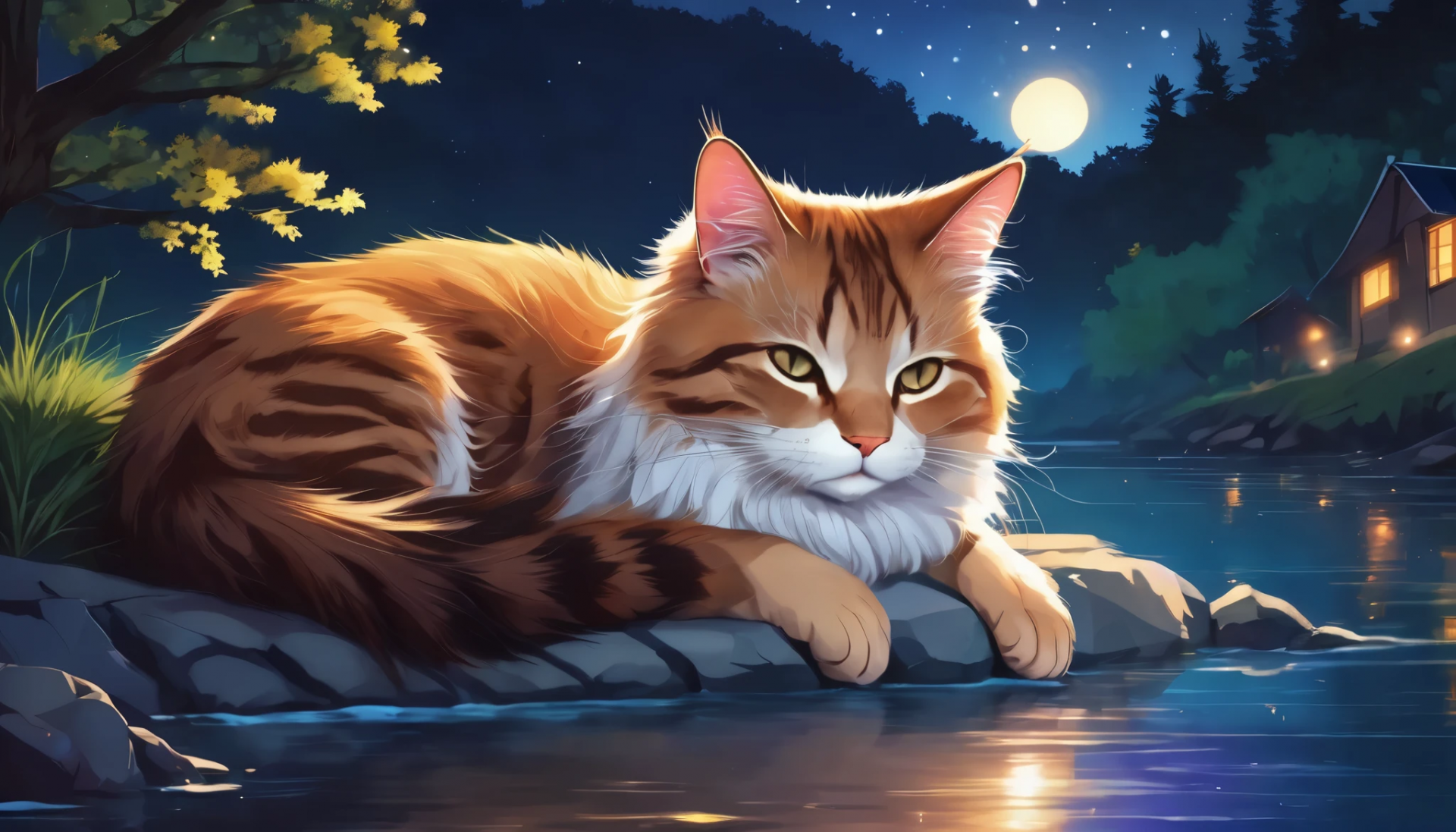 A cat sitting quietly by the riverside, gazing at the calm water under a soft natural light.