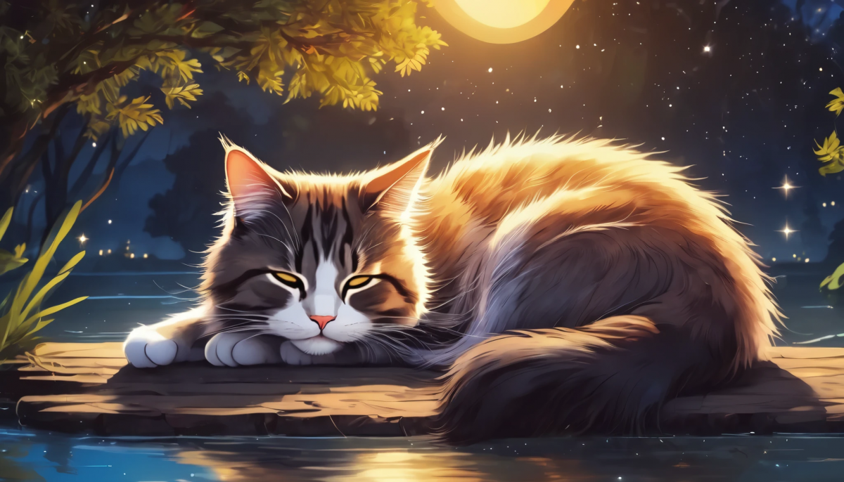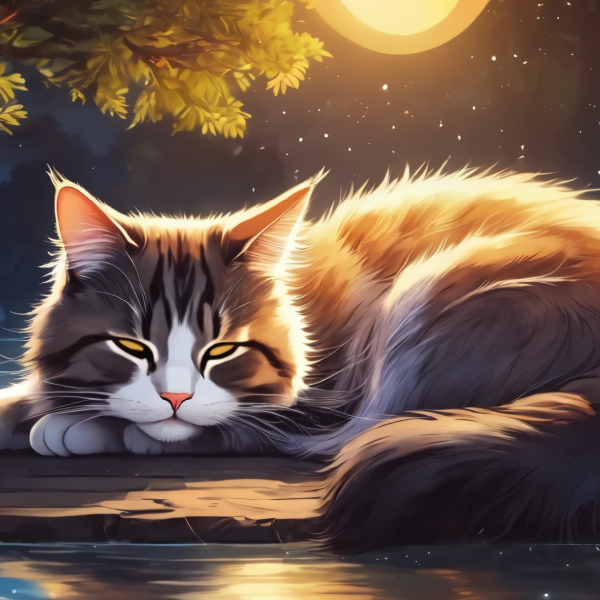 Cute sitting on a riverside at night, calm scene of sleeping cat.