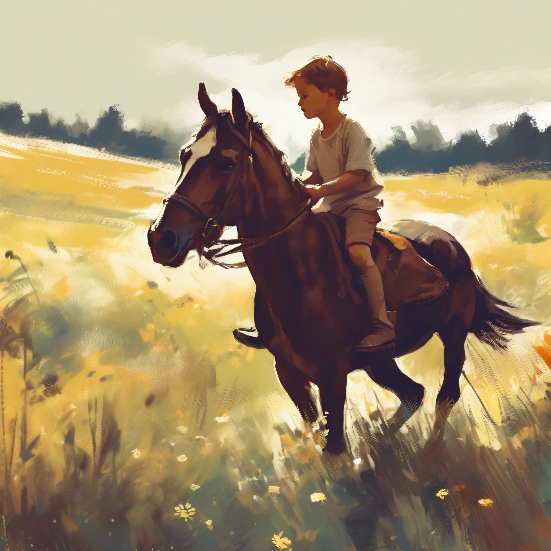 The peaceful setting highlights the strong bond between the rider and his horse, making this image perfect for themes of rural life, adventure, and childhood memories.