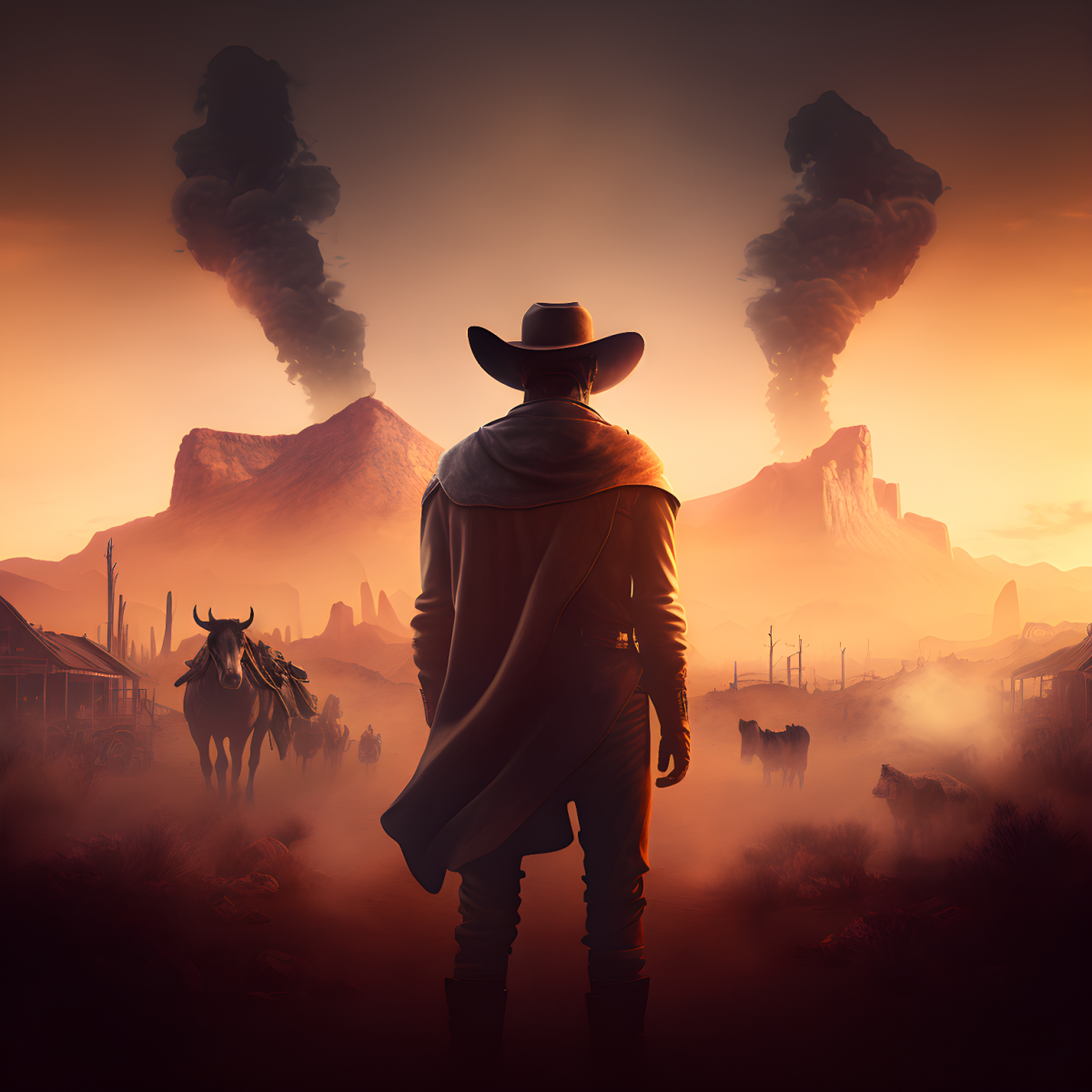 Cowboy back looking to the destroyed city