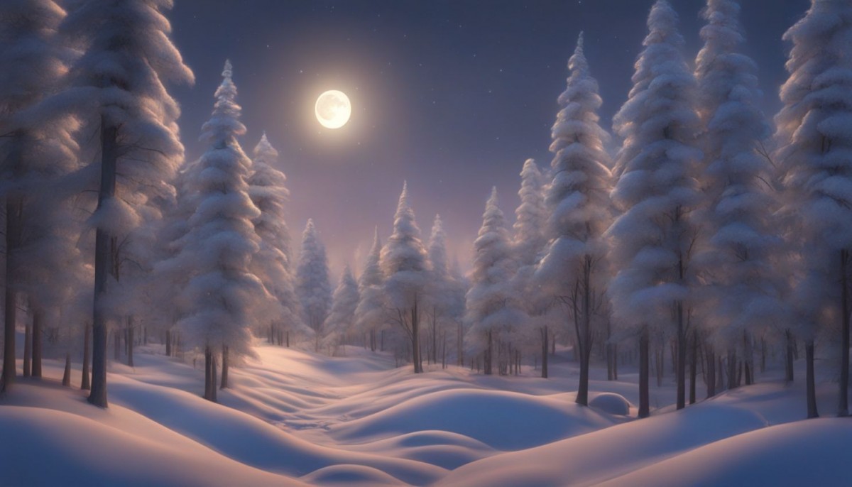 Shining silver moon over the pine forest. Trees are covered by snow.