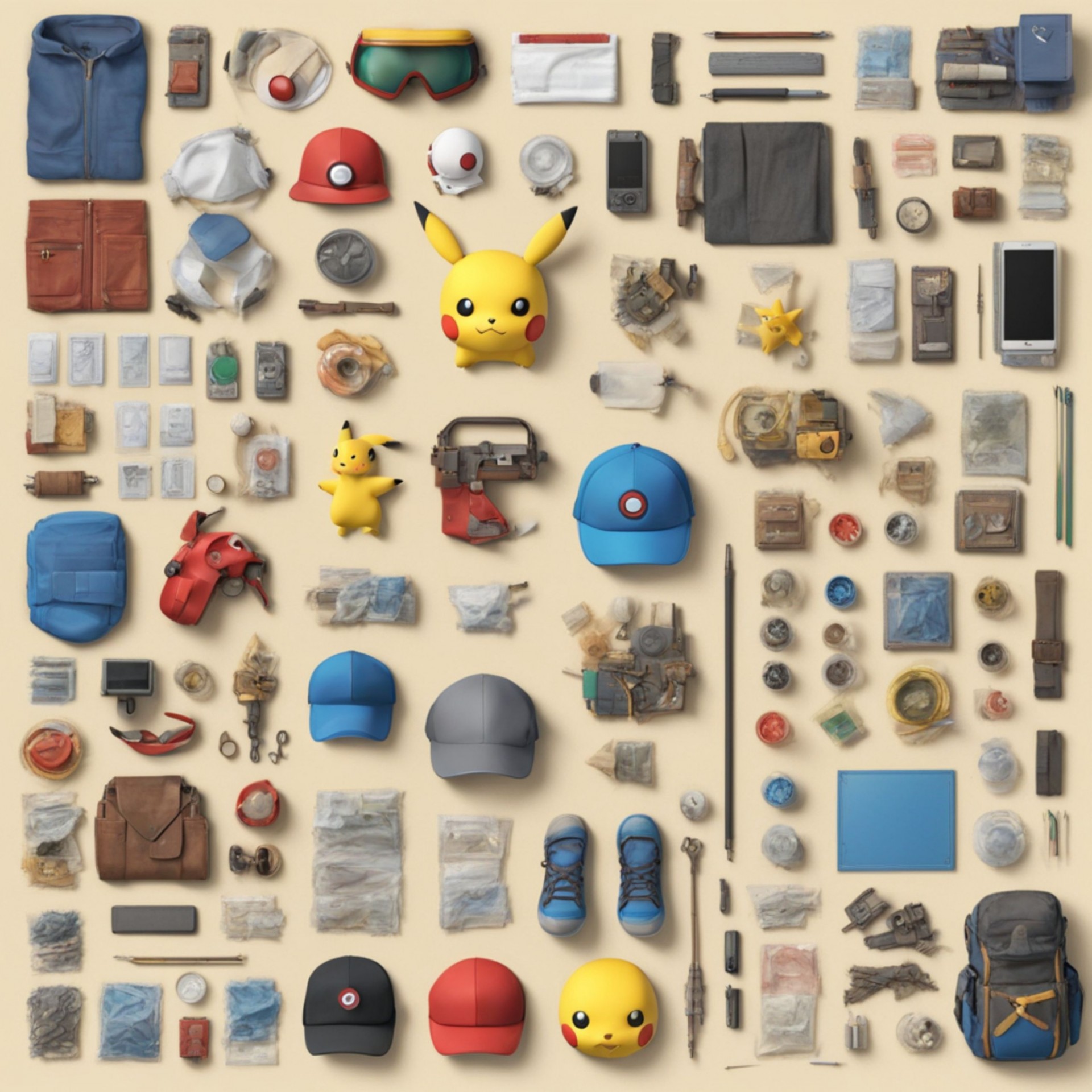 Knolling image of Pokemon gears and equipment.
