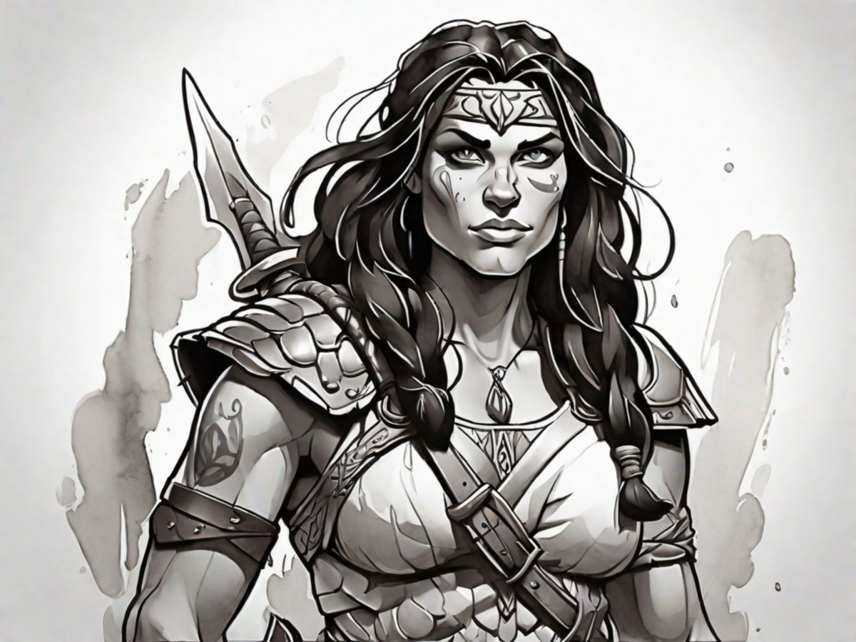Outline art of adult coloring page featuring a fierce female barbarian warrior.