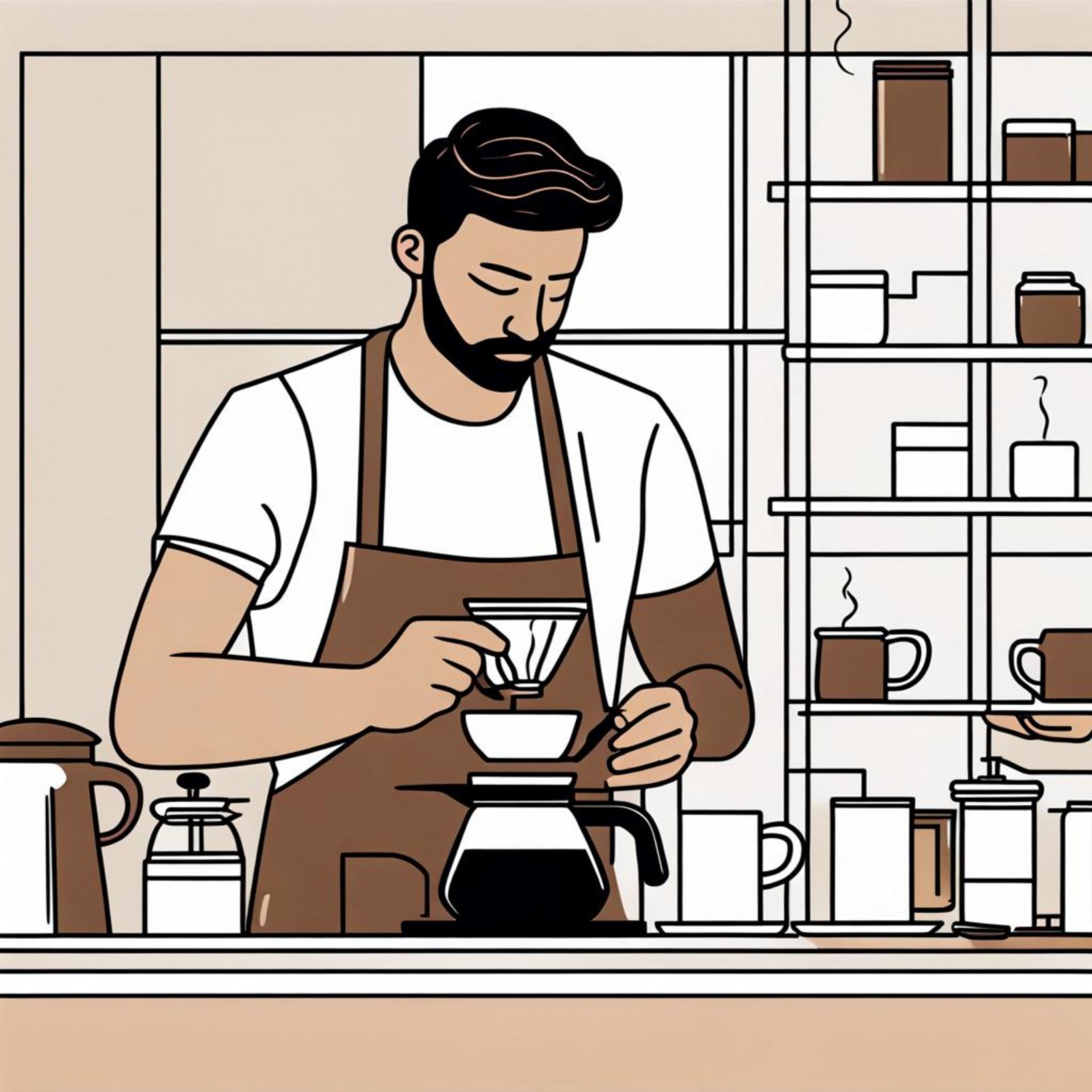 Flat illustration, line art of a male barista making coffee.