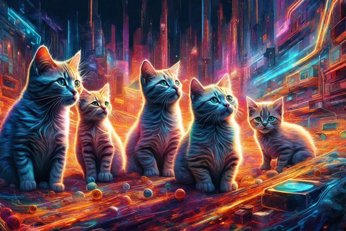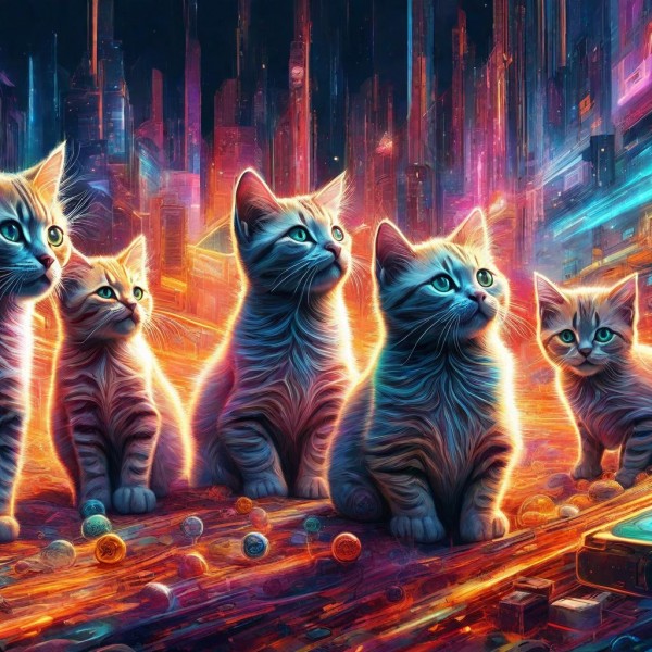 5 kitten looking one side, neon colorful background.