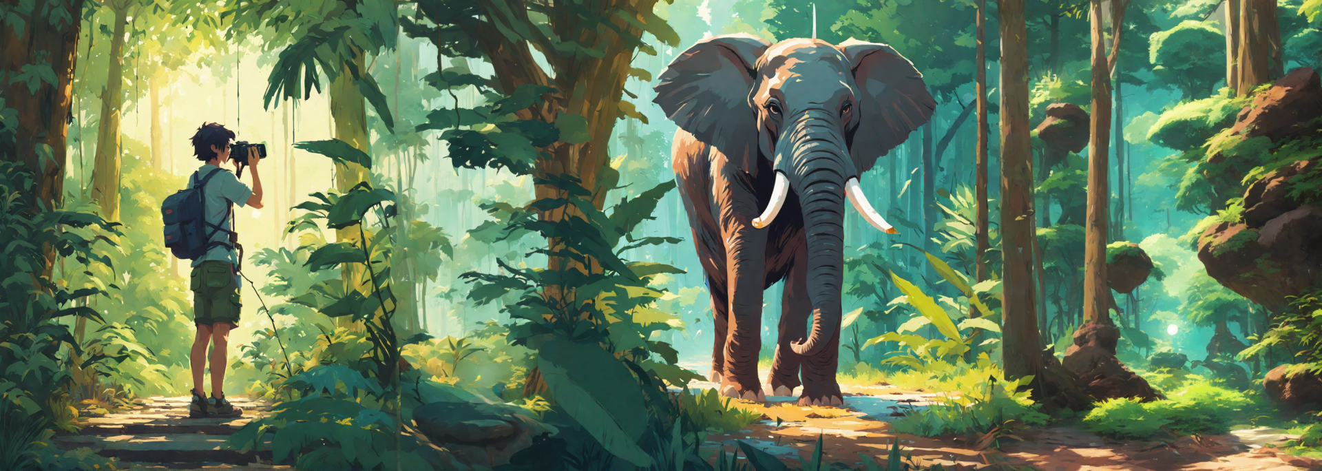 Forest scene of a boy taking a picture of an elephant in the jungle,