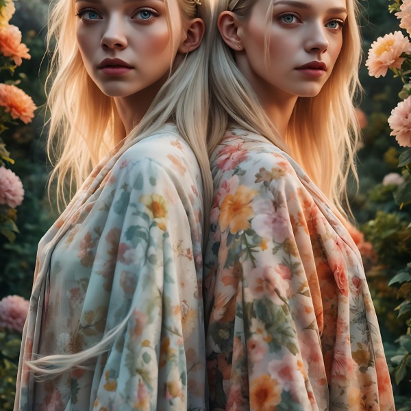 Two girls standing back to back. Background floral.