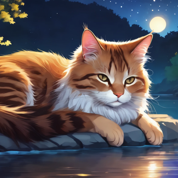 A cat sitting quietly by the riverside, gazing at the calm water under a soft natural light.