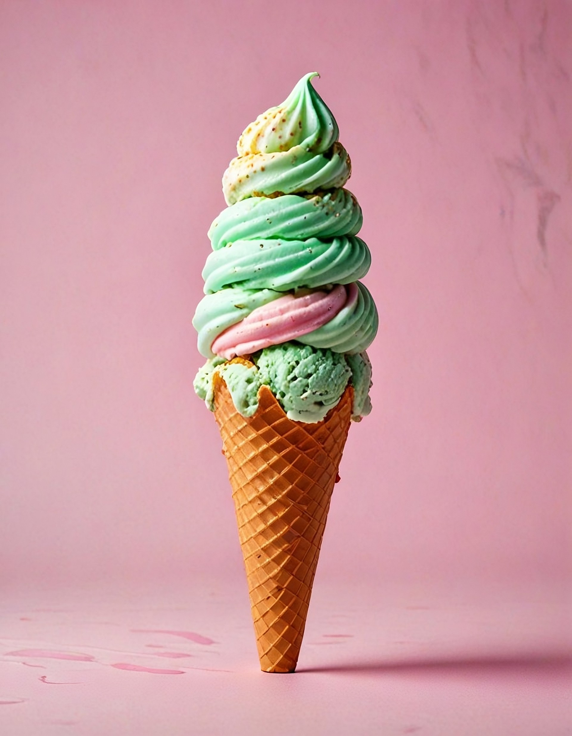 This delicious ice cream cone is on a pink background.